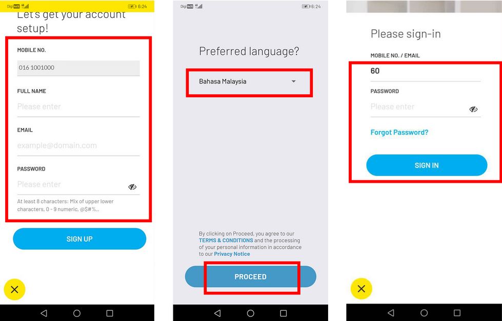 Anda dapat muat turun terlebih dahulu aplikasi MyDigi Mobile yang boleh didapati di App Store atau PlayStore secara percuma. Lalu ikuti langkah di bawah ini: