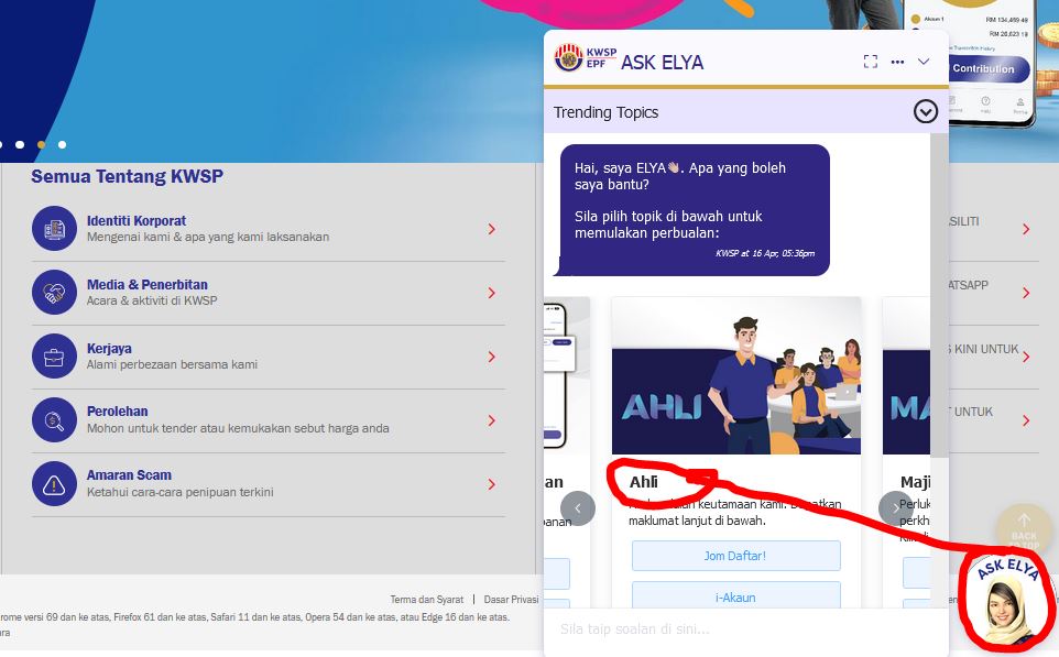 ELYA ni adalah chatbot yang dibangunkan oleh KWSP untuk membantu orang semak baki KWSP. Tapi, kalau nak guna ELYA ni, Anda kena guna website KWSP.