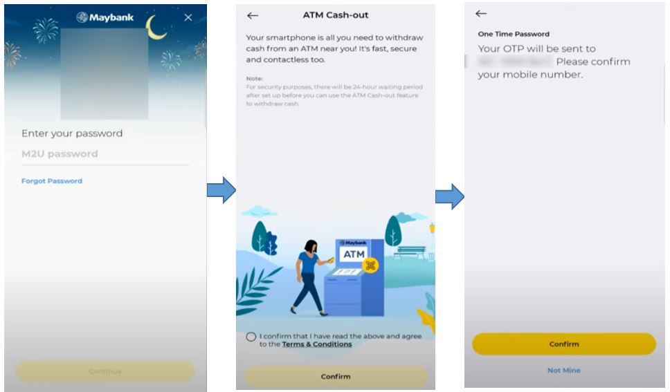 Untuk menggunakan fungsi ATM Cash-out melalui MAE Maybank, Anda perlu terlebih dahulu mengaktifkan ciri ATM Cash-Out pada aplikasi MAE yang mengambil masa sekitar 24 jam sebelum dapat digunakan.