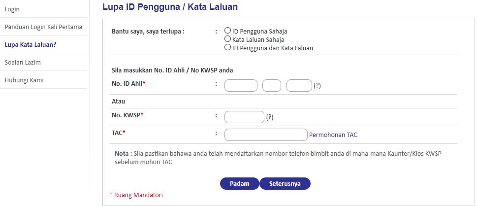 Sebelum menggunakan fungsi lupa ID Pengguna / Kata Laluan, ahli perlu mendaftarkan nombor telefon bimbit bagi tujuan penerimaan TAC. Pendaftaran nombor telefon bimbit boleh dilakukan di mana-mana Kios atau Kaunter KWSP.