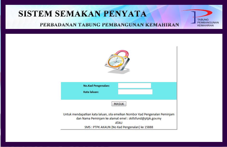 Untuk mendapatkan kata laluan, sila emelkan nombor kad pengenalan peminjam dan nama peminjam ke alamat emel : skillsfund@ptpk.gov.my